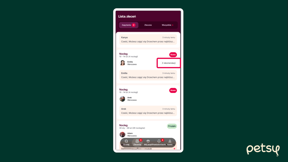 Dla Opiekunów przygotowaliśmy widok, który od razu informuje o rodzaju wybranej usługi, konkretnych datach oraz precyzyjnej liczbie dni, spacerów lub wizyt. Na kafelku widoczna jest teraz ostatnia wiadomość z czatu, co pozwala natychmiast wrócić do przerwanej rozmowy. Wprowadziliśmy również oznaczenie „z rekomendacji” – dzięki niemu Klient wie, czy dane zapytanie trafiło do Petsittera bezpośrednio, czy zostało wysłane z ekranu sugestii. Widoczność imienia i zdjęcia Petsittera ułatwia szybką identyfikację osoby, której powierzamy opiekę nad pupilem.