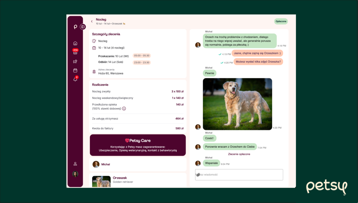 Zmieniliśmy sposób wyświetlania detali zlecenia, stawiając na nowoczesny design i czytelność. Kolorystyka petsy została zestawiona z eleganckim kremowym tłem, co poprawia komfort wizualny podczas dłuższego korzystania z platformy.