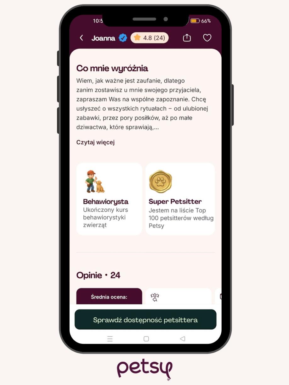 Najlepsi petsitterzy na platformie otrzymali wyróżnienie Top 100 petsitterów na Petsy. To oznaczenie przyznawane jest osobom, które konsekwentnie zapewniają najwyższy poziom opieki, mają bardzo dobre opinie od opiekunów pupili, duże doświadczenie oraz wysoką niezawodność w realizacji rezerwacjiZWERYFIKUJ?. Dzięki temu już na pierwszy rzut oka widać, którzy petsitterzy należą do najbardziej sprawdzonych i zaufanych na platformie.