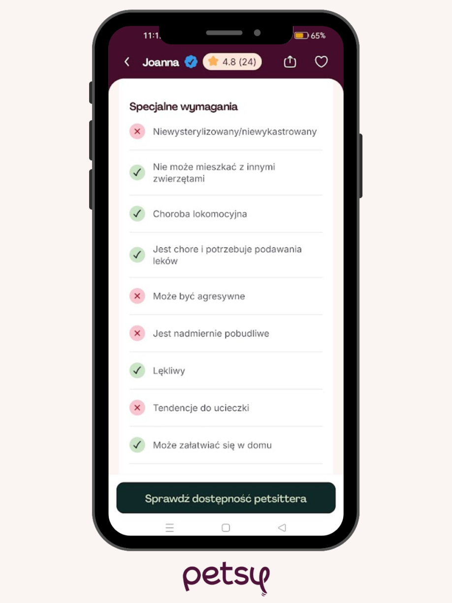 Przebudowaliśmy też sekcję dotyczącą specjalnych potrzeb pupili. Teraz w profilu wyraźnie widać zarówno potrzeby, które petsitter akceptuje (zaznaczone), jak i te, których nie obejmuje w swojej opiece.