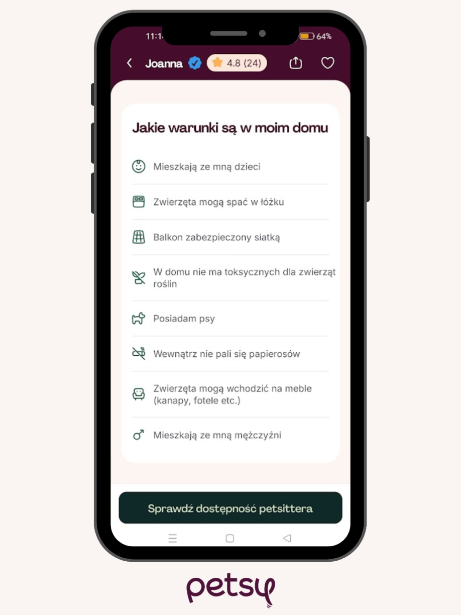 Dodaliśmy osobną sekcję, która w jednym miejscu opisuje warunki noclegu u petsittera. Klient może szybko sprawdzić, jak wygląda przestrzeń, w której pupil będzie przebywał, jakie są warunki mieszkaniowe oraz czy w domu są inne zwierzęta.