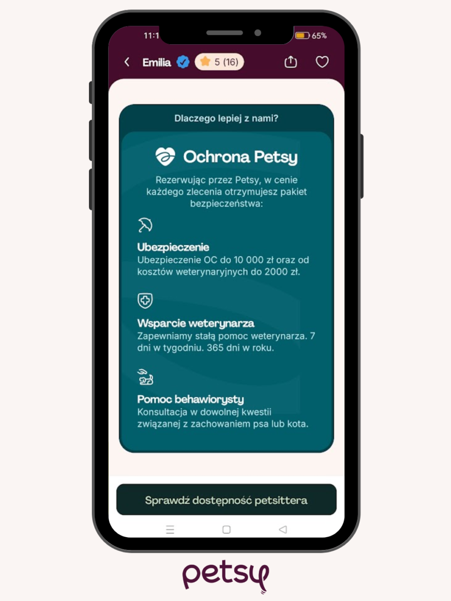 Poprawiliśmy również sposób prezentowania Petsy Care, czyli ochrony, która jest ważnym elementem bezpieczeństwa na platformie. Przebudowaliśmy tę sekcję tak, aby była bardziej widoczna i zrozumiała, a użytkownicy od razu wiedzieli, że rezerwacje są objęte ochroną i w jaki sposób działa Petsy Care.