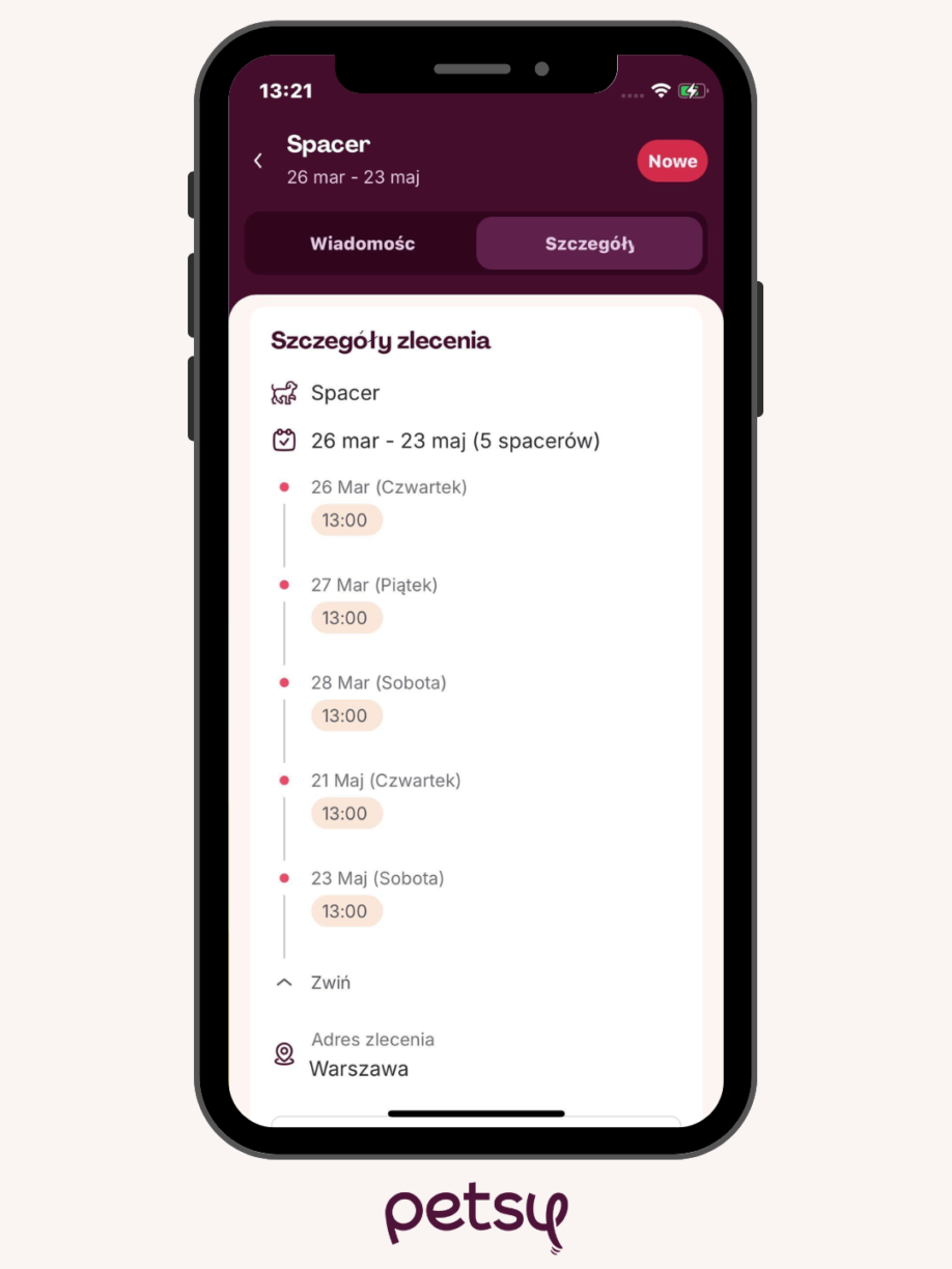 Dodaliśmy też nowy sposób podglądu zleceń, które składają się z wielu terminów w ramach jednej usługi, np. serii spacerów w kilku dniach. W szczegółach zlecenia zamiast długiej listy pokazujemy czytelny widok nadchodzących terminów, który automatycznie „czyści się” z tego, co już zostało zrealizowane — dzięki temu widzisz tylko to, co jeszcze przed Tobą, bez przewijania historii.