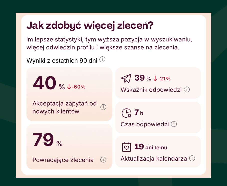 - Akceptacja zapytań od nowych klientów: Klucz do oszczędności czasu. Jeśli odrzucasz zbyt wiele zapytań, Twój profil lub kalendarz mogą wymagać doprecyzowania, by nie przyciągać „nietrafionych” zleceń.